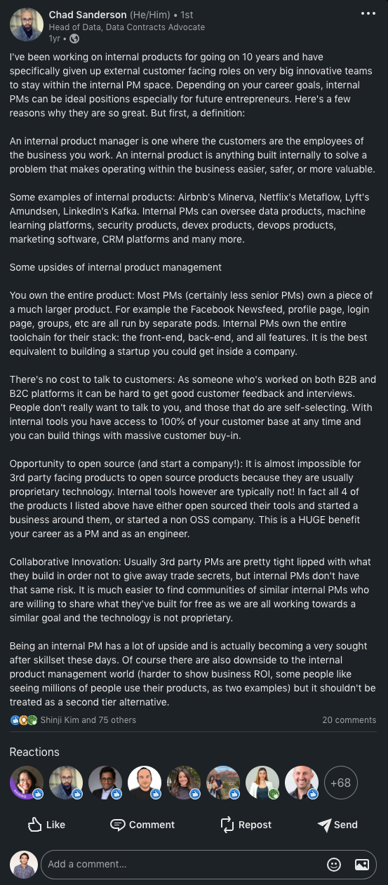 (01:18:57) Chad brought up the valuable skills he acquired as an internal product manager.
