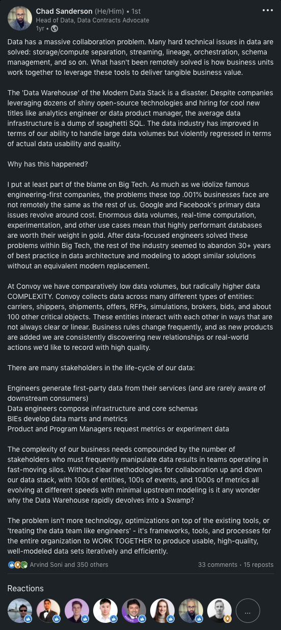 The other problem is downstream. The downstream problem occurs when many businesses have invested in ELT (loading data from various sources, dumping it in the warehouse, and doing all the transformations downstream). If you're living in that world and you're not going back to the producer and ensuring that you're generating the correct data you need, data developers and analysts inevitably spend an inordinate amount of time writing SQL against this mess of spaghetti code in the warehouse.
