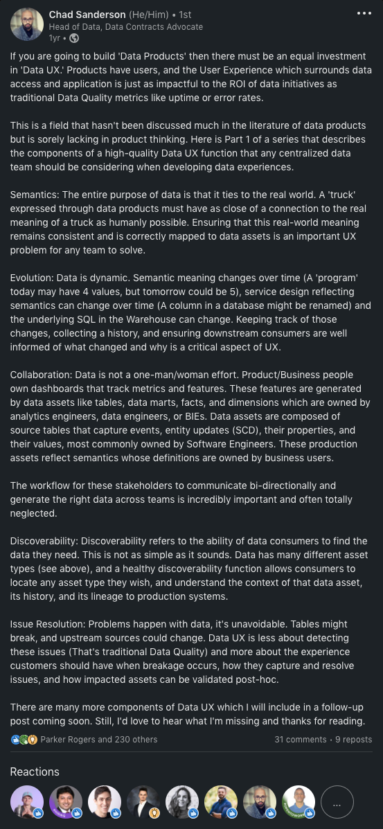 (01:11:55) Chad shared components of a high-quality Data UX function that any centralized data team should consider when developing data experiences.