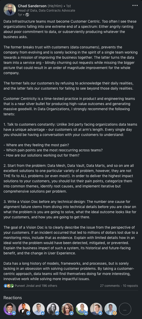 One of the biggest pieces of advice I can give is regularly engaging with your customers. Even if we don't always think of data consumers within our company as customers, that's exactly what they are. They use the products and services that we build and provide. So, talking to data scientists, analysts, and non-technical stakeholders on a weekly basis can be incredibly valuable.