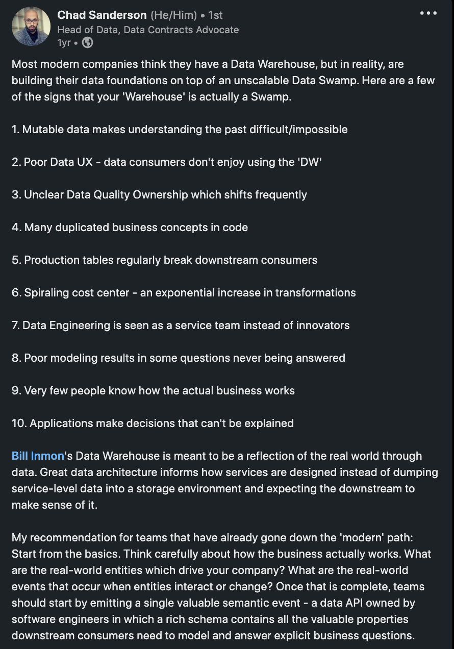 I believe the modern data warehouse is broken for several reasons. First, queries are often written in an unscalable way, and upstream producers generate data in an unscalable way. Additionally, we don't talk enough about the semantics of the data or how it's tied back to real-world entities or events. As a result, data personnel can spend weeks talking to people to understand how the business works before they can write queries against the warehouse. This is not scalable and not what the data warehouse was intended to be.