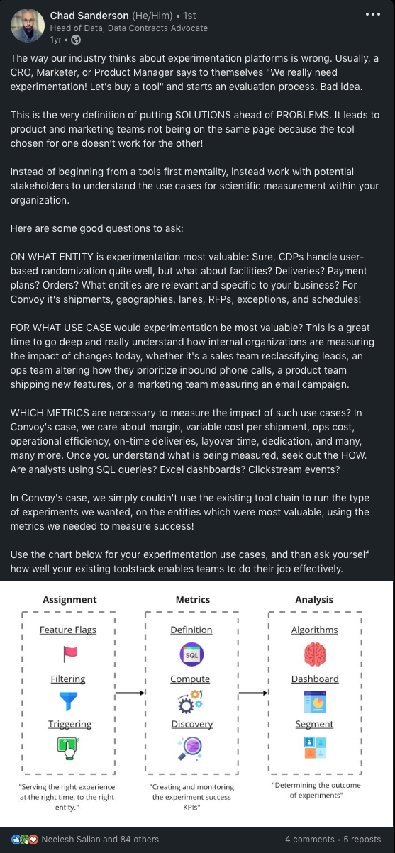 The most important takeaway from Data Council that I want to emphasize is that setting up your own experimentation system is quite challenging. It's often not enough to rely solely on an external vendor.