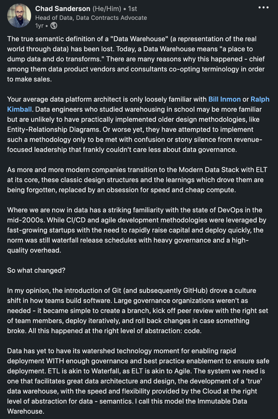 (44:38) Chad explained why the modern data warehouse is broken and why the "Immutable Data Warehouse" can be a solution.