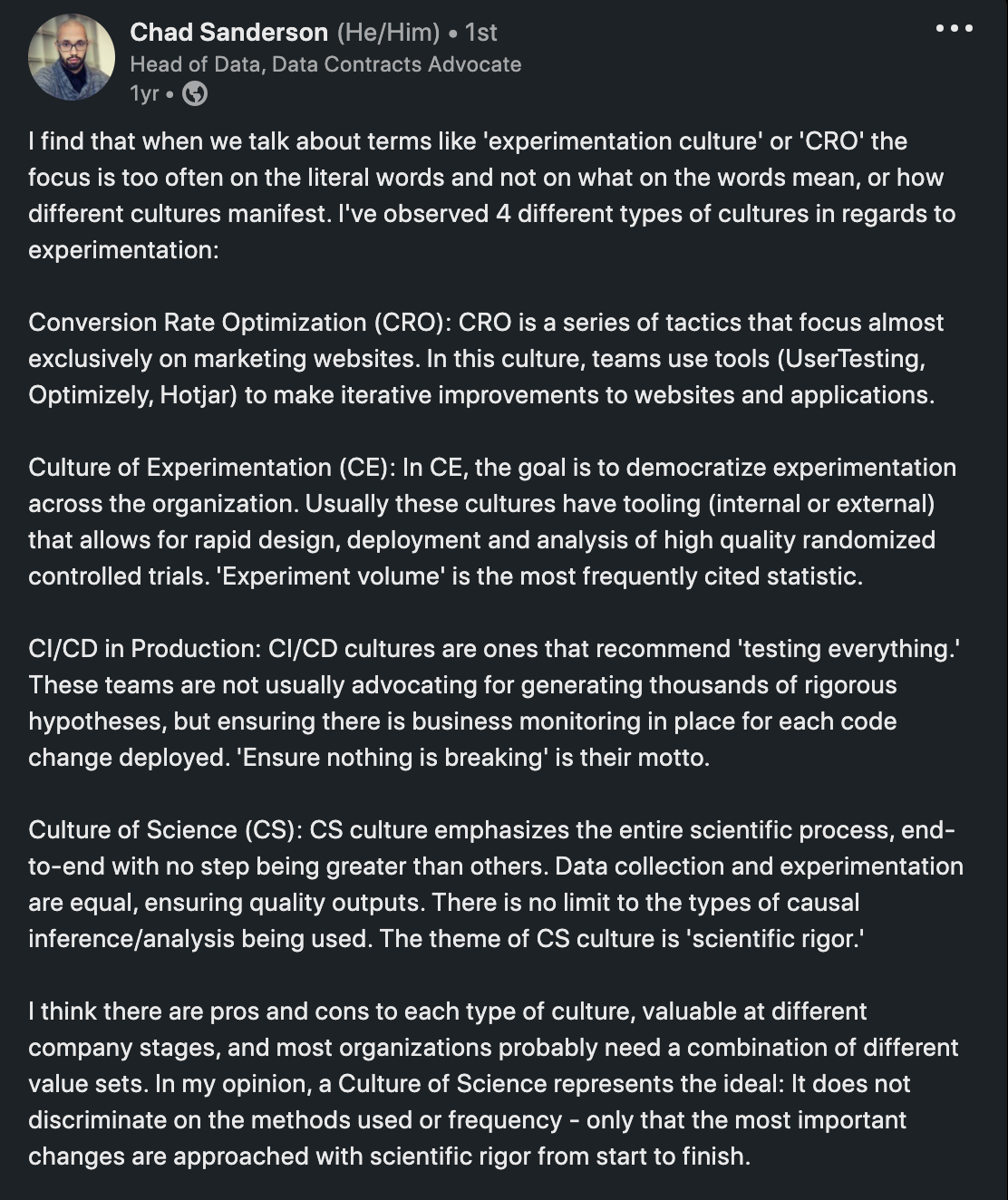 (15:32) Chad discussed the differences in experimentation cultures at Subway, SEPHORA, and Microsoft.