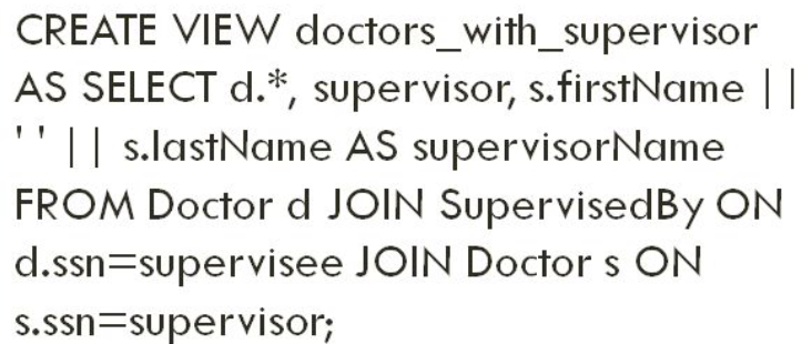 An example query to create a view is shown below. Here we created a view called doctors_with_supervisor and saved it to use later.