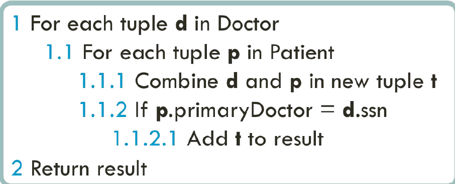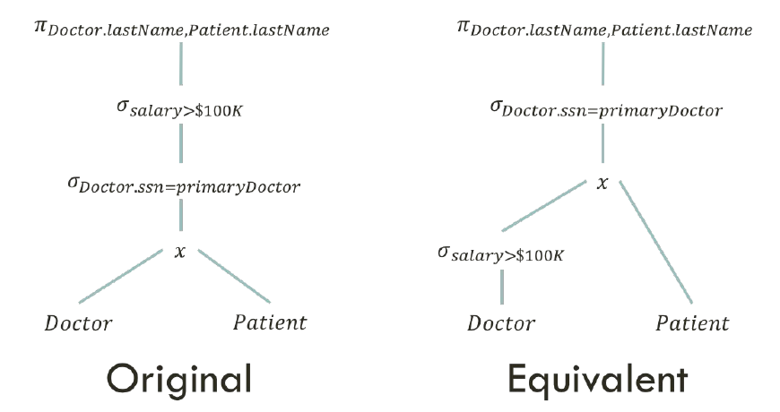 The original version returns the last names of doctors and patients, where the doctors’ salaries are above $100,000. The equivalent version does the same thing, but is much more efficient. Because the salary restriction formula only applies to doctor, we can put it last.