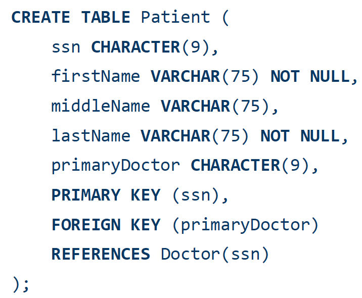 The Create function below creates a table database that stores the Patient records, with attributes including ssn (primary key), firstName, middleName, lastName, and primaryDoctor. The primaryDoctor is a foreign key the refers to the Doctor table’s ssn.