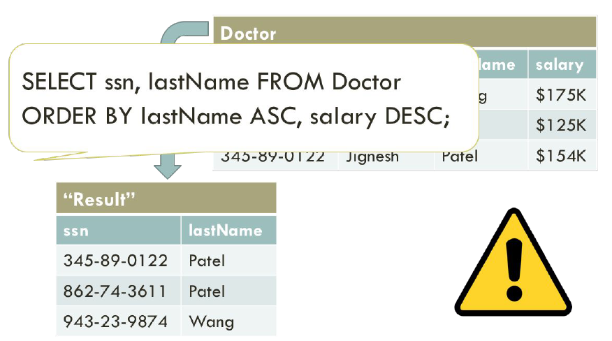 Lastly, the ORDER BY keyword is used to sort the result-set in ascending or descending order. The ORDER BY keyword sorts the records in ascending order by default. To sort the records in descending order, use the DESC keyword. The query below sorts our values by increasing doctor’s last name (alphabetically) and decreasing doctor’s salary (numerically).
