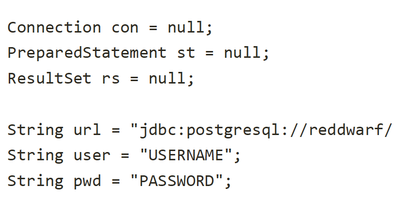When we want to connect to a database, we need to create a URL. In this example below, we are connecting to a PostgreSQL, following by a local host and schema. Username and password are required, so we can specify them either in the code or in the command.