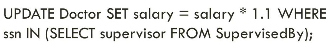The SELECT statement chooses all the supervisor attributes from the SupervisedBy table (SupervisedBy’s supervisor is a foreign key that references Doctor’s ssn). The UPDATE statement updates the salary by 10% in the Doctor table where the doctor’s social security number is equal to SupervisedBy’s supervisor.