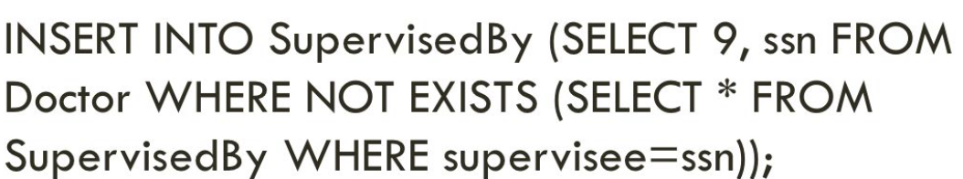 The SELECT statement chooses all the values from SupervisedBy where superviseee equals ssn. The INSERT INTO statement then inserts into the SupervisedBy table the values 9 and social security number from the Doctor table that do not exist in the results from the previous SELECTED query.