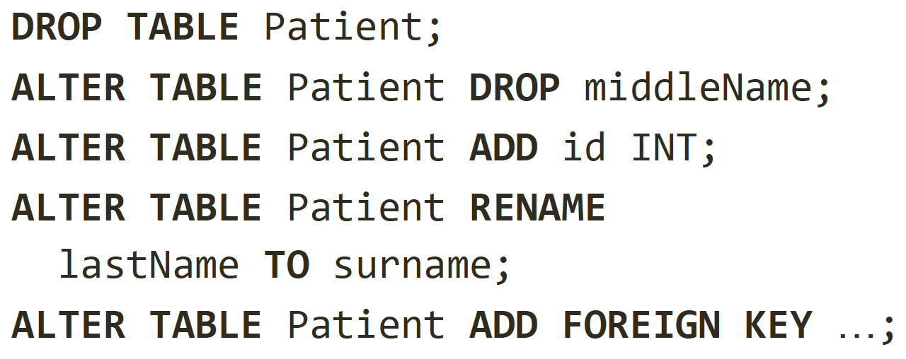 We can also change our tables. As shown below, we can drop a table, drop a column from a table, add an extra column with its type, rename a column, and add a foreign key.