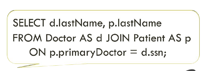 Most of the time, we do not want a Cartesian join, and we end up with one because we failed to provide a filter on the join. Instead, we want to join tables using a filer with keyword JOIN and ON. As seen, the primaryDoctor attribute in Patient table is the same as the ssn attribute in Doctor table.