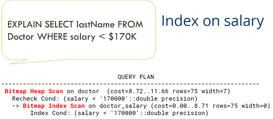 Below is the case where there is an index based on salary. The Bitmap Index Scan checks the index on doctor_salary. It is not useful here since the lastName attribute (which we want) can only be found in the Doctor table. Thus, Postgres can use the index to find matching records, but then must go to the table to get the lastName value.