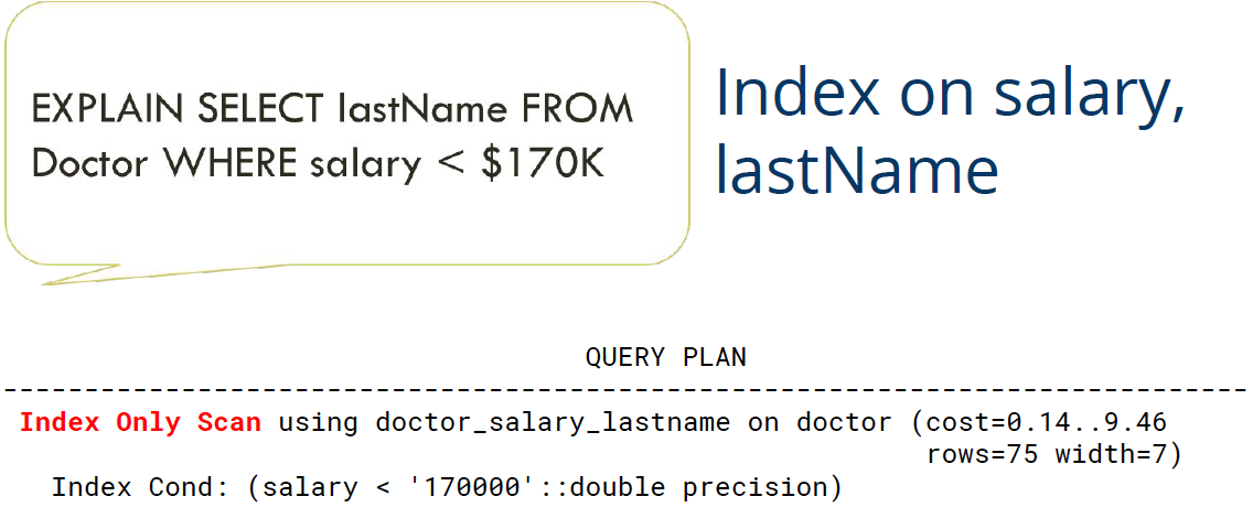 Below is the case where there is an index based on salary and lastName. The Index Only Scan now verifies that we don’t have to go back to our Doctor table at all, since the lastName attribute goes along with salary. Postgres can use this index to answer the entire query.