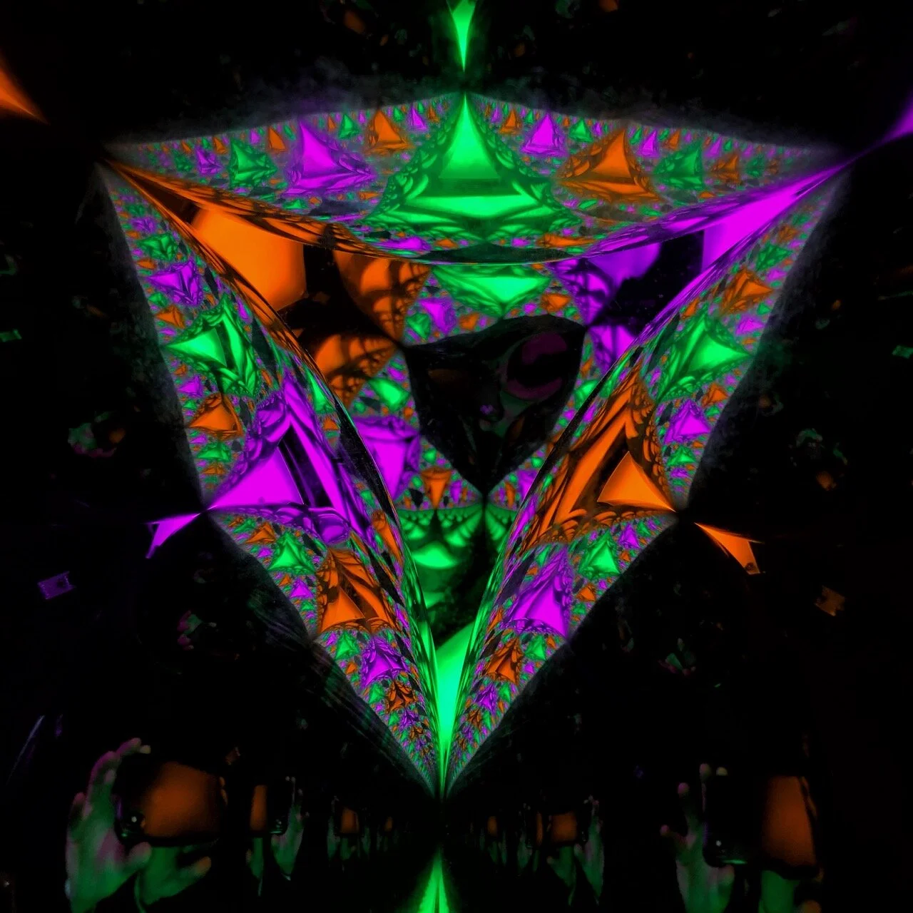 We then took this apparatus into a research lab. On three of the four faces of that pyramid (where a face is a triangle connecting the center of three spheres), we placed color poster-boards in front of them and showed light on the poster-boards. That light reflected off the sphere and entered an inner chamber that the four spheres made.