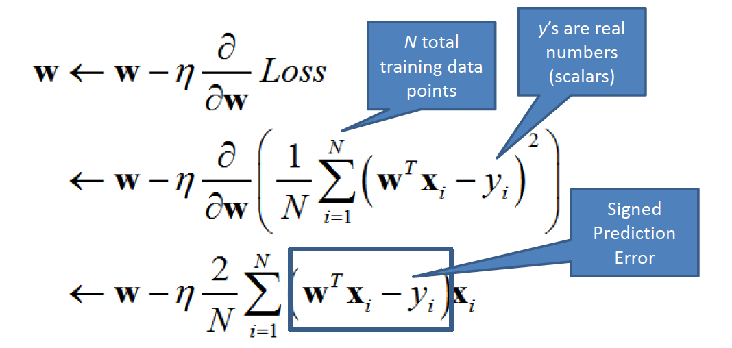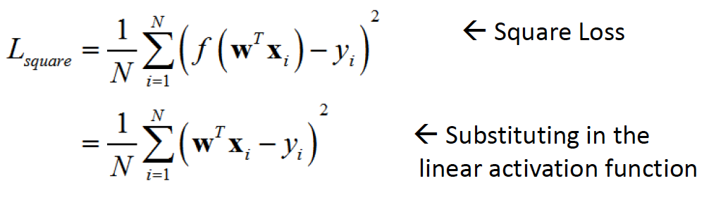 Let’s look at that in more detail. The steps below explain how batch gradient descent for square loss with linear activation function works: