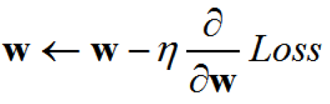 Gradient descent is a procedure for minimizing a loss function to find w. Essentially, we compute the partial derivatives of the loss function to give us the slope that tells us what direction to change each dimension of w to get closer to the minima. Mathematically, we want to iterate on this equation below (where eta is the learning rate):