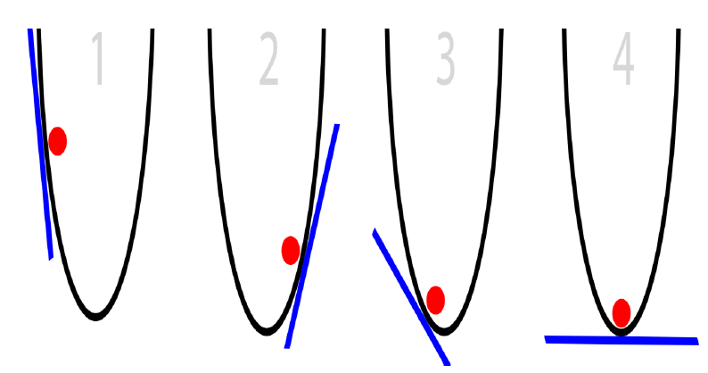 The image below shows the error surfaces for one layer of units. It is a convex optimization problem with a unique global minima. Think of the cost function for this scenario as a mountain range and gradient descent as the path you take to the ski the fastest way down a slope.