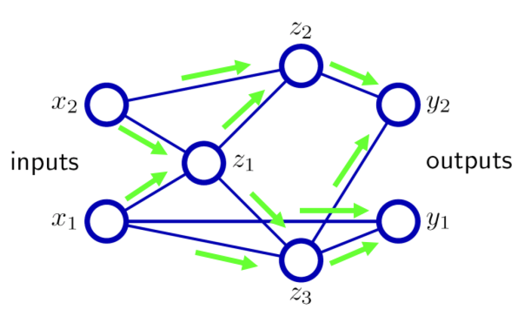 In the forward pass below, the inputs on the left (x_n) propagate forward through the arrows to the hidden layer of units (z_n), which in turn project to the output layer (y_n). The output is compared with the value given by a trainer, and the difference is used to update the weights to the output unit to reduce the error.