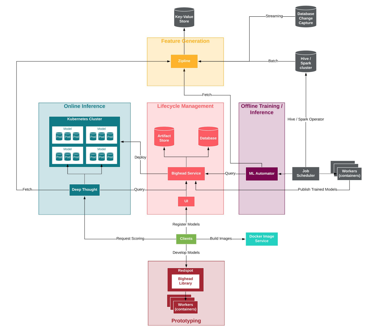 Bighead is Airbnb’s ML platform. We started working on it in 2017 when I transitioned to this product team. Originally, four people were pulled from different parts of the data infrastructure team who wanted to work on ML infrastructure and myself, who was going through a 3-month trial as a product manager. We outlined a plan to build these five core components and designed the interfaces between them.