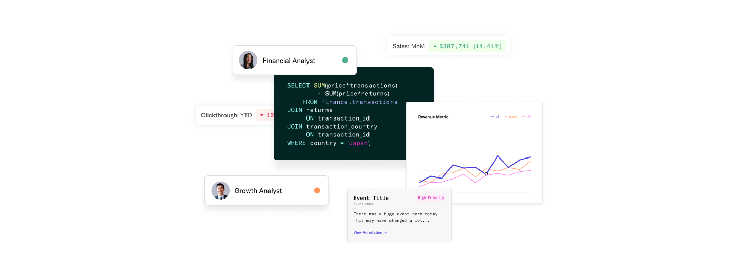 Metrics Catalog is geared towards governance and interfaces. I think there’s a unique attribute of metrics that is under-valued and not widely discussed: a metric is fairly stable in the company’s history. Metrics don’t move around. Their definitions might change, but they’ll probably iterate slowly and eventually get fairly locked down (especially the company’s most important metrics). That makes them an interesting vehicle for capturing institutional knowledge over time — the ability to say this thing happened at this moment in time. This can probably save data organizations an unbelievable amount of time if done well.
