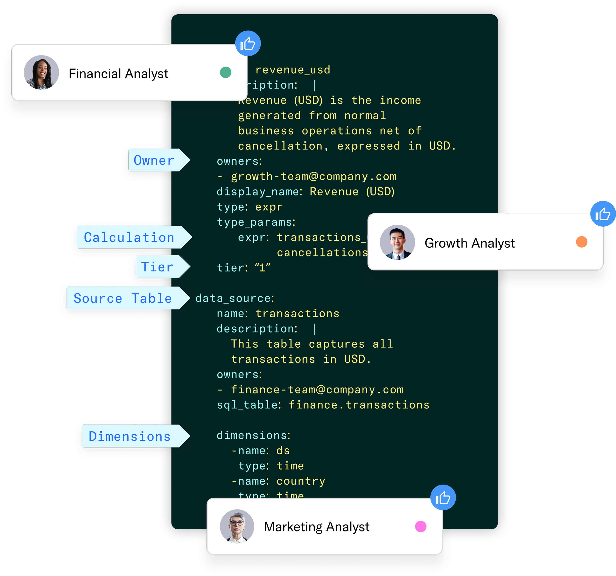 The purpose of the Metrics Framework is to lay out the definitions of metrics and their semantics and then prepare to serve those metrics efficiently through various interfaces. There’s some amount of governance supplied because these metrics in our framework are defined in YAML, and those are contributed to Git. So there’s some kind of standard code review process that companies follow, which applies some sort of technical governance to the definitions of the metrics.
